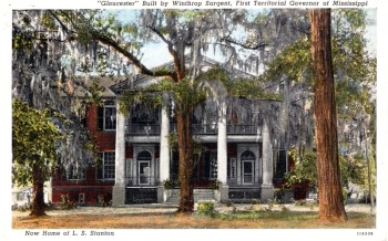 Gloucester, Natchez – (1803, 1807, c. 1830) (National Register) Also occasionally referred to as the Samuel Young House or the Winthrop Sargent House in reference to the first two owners. Gloucester was constructed in 1803 as a hipped-roof, two story structure for Samuel Young. In 1807, new owner Winthrop Sargent, the first Governor of the Mississippi Territory from 1798-1801, hired an unknown brickmason to enlarge “Gloster Place.” That brickmason added the two fanlight entrances with the unusual flanking, detached sidelights, as well as the half-octagonal side elevations. The Tuscan portico with a bull’s-eye window in the pediment was added circa 1830. While overshadowed by many later Natchez mansions, Gloucester is the oldest of Natchez’s grand mansions, predating Levi Weeks’s arrival by several years, and is an excellent example of Federal architecture in Mississippi.