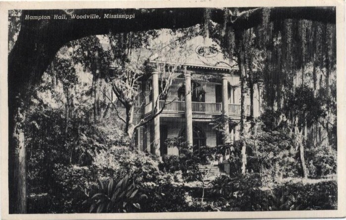 Hampton Hall, near Woodville, Wilkinson County – (c. 1825-32) (National Register) Located about a mile from Woodville, Hampton Hall is a late, Federal style mansion surrounded by live oaks, boxwoods, and azaleas which even the 1930s WPA book Mississippi: A Guild to the Magnolia State reported as “almost obscure[ing] the two-and-a-half-story, columned…structure.” According to the National Register nomination form, “The house is important for its excellent state of preservation and its integrity of setting, and as an illustration of the combination of Federal and Greek Revival styles employed in early-Nineteenth Century Mississippi.” The focal points of Hampton Hall are the large fanlight entrance, the monumental two-story Doric portico, and the elliptical stairway. Hampton Hall was constructed sometime between 1825 and 1832; however, as with many early Mississippi houses, the records are sparse. Hampton Hall was the childhood home of author and artist Blanche McManus Mansfield, who designed the prayer book and alter cloths for King Edward VII’s coronation. Hampton Hall formerly contained parlor murals executed by Blanche Mansfield but those have been painted over for decades.