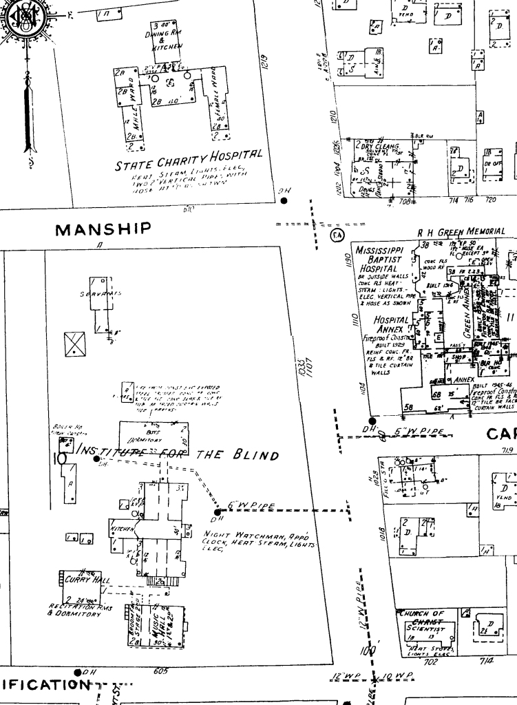 1946 Sanborn map for Jackson, showing the Blind Institute along with its proximity to the Baptist Hospital and State Charity Hospital