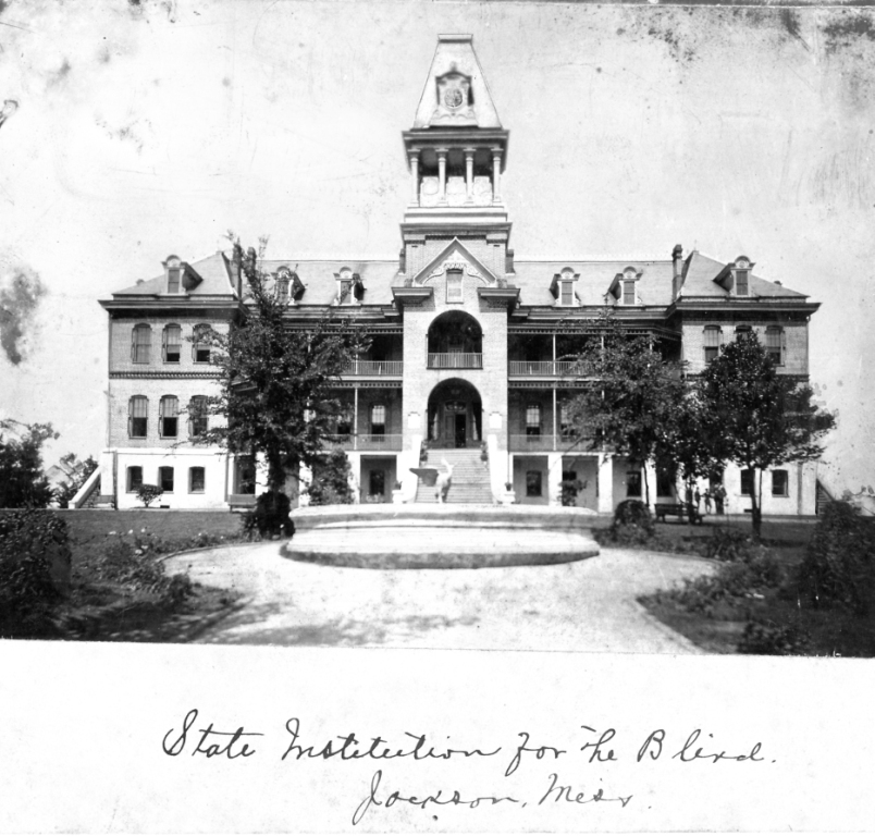 H. Grady Howell, Jr. in his recently published book, “Chimneyville” included an article about Jackson in 1859, written by a Prof. George Steuckrath who was traveling in Jackson at that time. Prof. Steuckrath reports: “—The Institution for the Blind is located in the northern part of the city, and receives a fostering care and pro’ection from the state through all seasons of the year. It is a large frame building with walks regularly laid off and adorned with the rarest kind of shrubbery.”