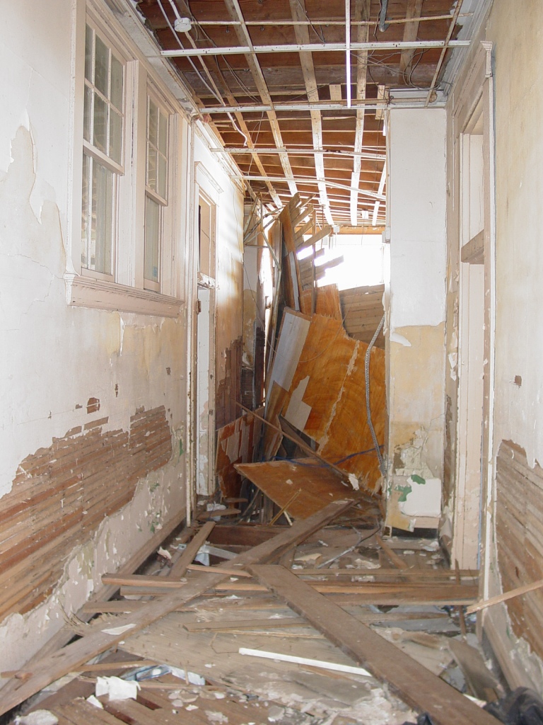 The school, which stood at the back of its lot on Beach Boulevard east of downtown Gulfport, was heavily damaged by the storm surge and the high winds of Katrina. About half of the roof on the original two-story section of the building was blown away, structure and all, and water from the surge poured through the first floor. You would think that combination would have destroyed the building right away, but as you can see in the photo of the second floor above, the building was still solid, and structural engineers said it was in need of shoring and a major roof repair to keep it in a mothballed condition until the owners could make decisions about its future.