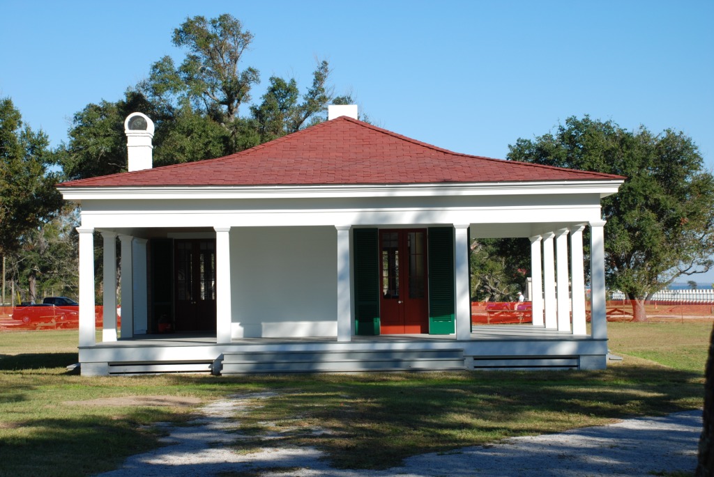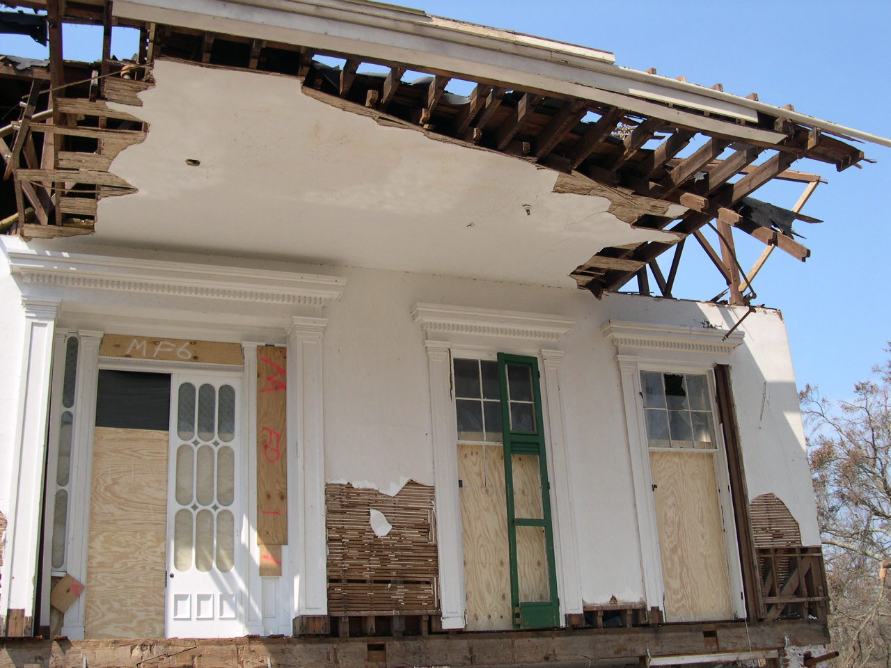 Of course, I have to start with Beauvoir (aka Jefferson Davis Shrine–a name whose religious overtones make me wince), even though most of you probably followed its rebuilding from beginning to end. Beauvoir is such a symbol of the Coast, and it was the landmark that people in the coastal communities would always ask about when I would visit after the storm. I remember the day after the storm when Gov. Barbour said “Beauvoir is destroyed.” I was shocked and horrified–could it be true? Thankfully not–as word began to trickle up from the Coast, it became clear that Beauvoir was very badly damaged, and some of its buildings were actually destroyed, but the main house itself was still standing, although admittedly not looking her best. Built on 8 or 9-foot high massive brick piers, the house itself only took a little water inside, but the force of the surge pulled off the wrap-around porch, and along with it, a large section of the roof that had extended out over the porch.