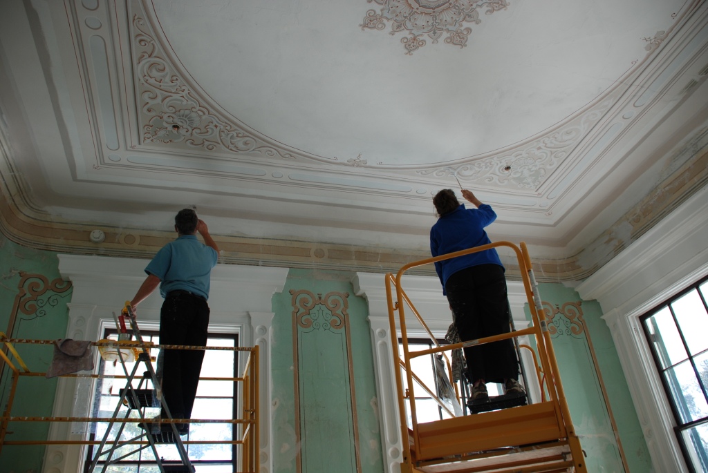 Artists re-touch and in some cases re-create the wall and ceiling "frescoes" in the main house