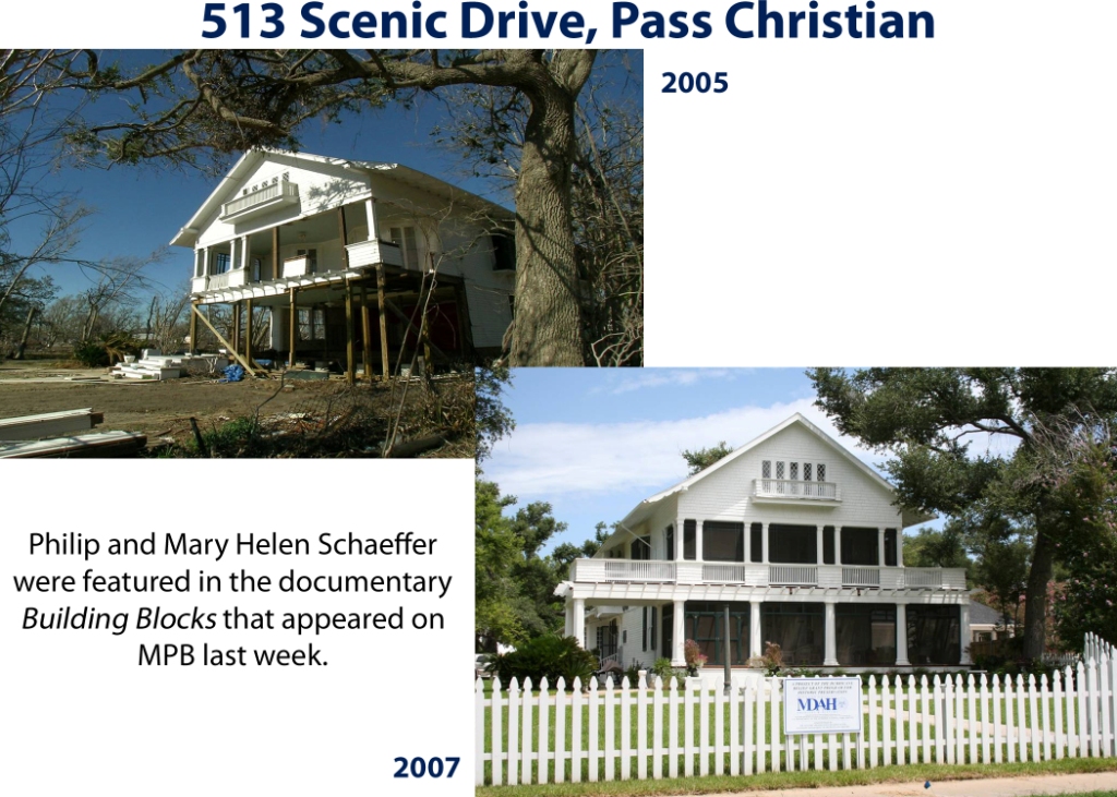 To recognize all the small and a few great residential landmarks that make up the historic neighborhoods of the Coast, I’ve put together a few before-and-after collages to show the types of houses and the massive damage that owners undertook to repair. Work is still underway, and many owners are either just now getting back into their houses or are still getting them habitable. This is just a sampling of the hundreds of historic houses being repaired from Waveland to Pascagoula, and to me these private owners are the true preservation heroes of Katrina.