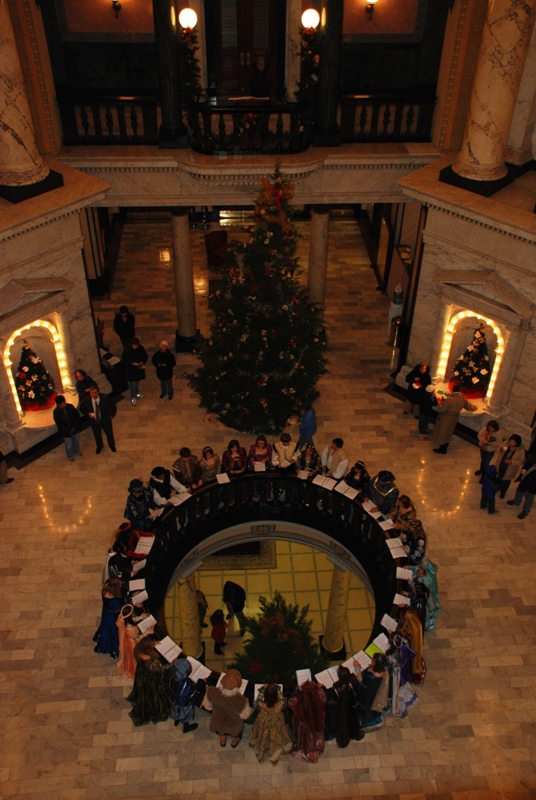 My last stop was the Old Capitol – which is also when very light snow “flurries” began. After all the greenery at the Manship, New Capitol and Governor’s Mansion, the minimal decorations at the Old Capitol were a bit of a letdown. The music filling the Old Capitol, however, was not. The acoustics are fantastic and anyone who has a chance should take an opportunity to hear a choral group perform in the space. I think the Old Capitol minimized the decorations because of recent issues with pest control in their fabrics. Perhaps they feared that bringing live plants into the space would hinder their efforts to rid the building of bugs.