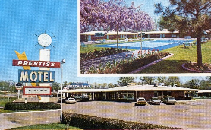PRENTISS MOTEL. 10 minutes from the heart of Natchez, Mississippi. On U.S. Highway 61 at Junction Hwys. 65–84 & 98. 150 attractively furnished rooms with air conditioning–Color TV–Direct-dial phones (free local calls)–Heated Swimming Pool–Coffee Shop–Dining Room–Lounge. Dine & Dance to Live Entertainment in the Governor’s Room. Phone (601) 442-1691.