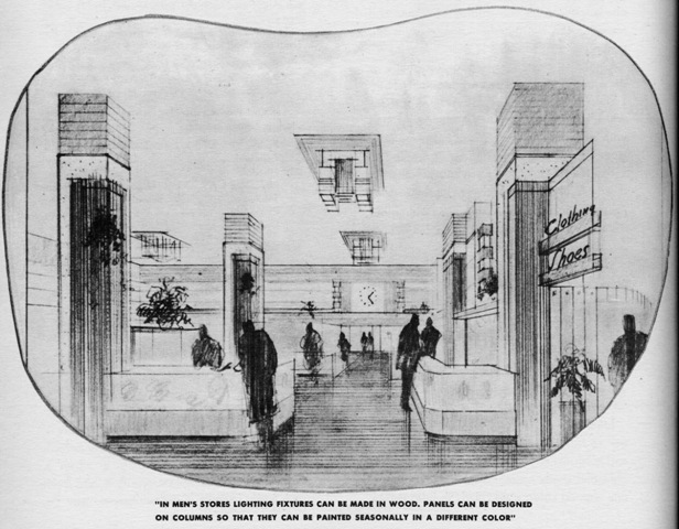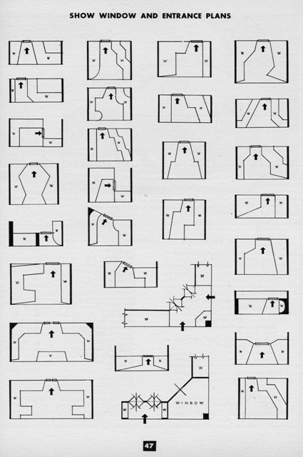 I admit I sometimes spend a good amount of money on a book that 99.999% of the population wouldn’t pay two cents for. I found one such book on a trip to Cincinnati a while back. Published in 1946, it’s called Modern Store Design by Gene Burke (B.S. Arch) and Edgar Kober of the Institute of Product Research in Los Angeles, California. I bought it because it is filled with beautiful sketches and drawings of how storefronts and retail spaces should be designed, and it’s all in the most Modern style you can imagine. In addition to the drawings, the accompanying text contains pointed advice about how design affects consumers (in the opinion of the authors, obviously).