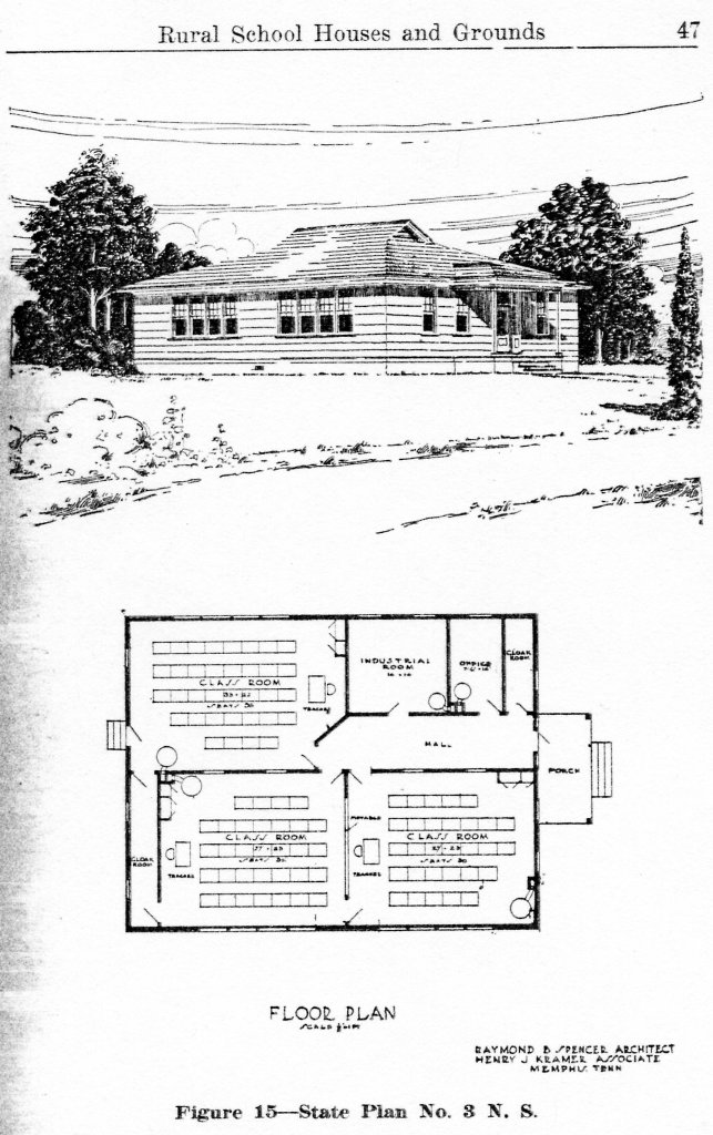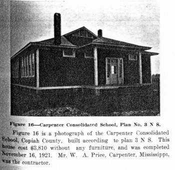 These plans had clearly already been used in actual construction when “Rural School Houses and Grounds” came out because the booklet includes photos of finished buildings like this one of the Carpenter School down near Utica (between Jackson and Port Gibson).