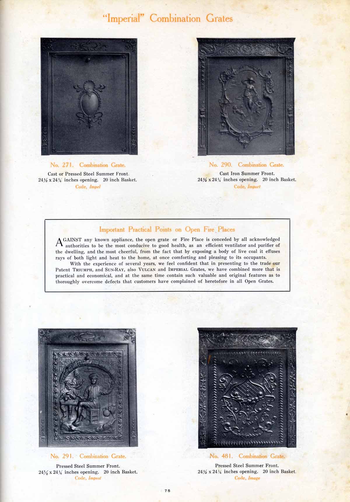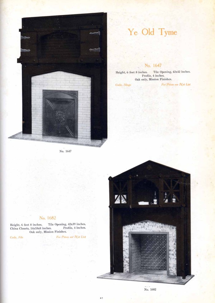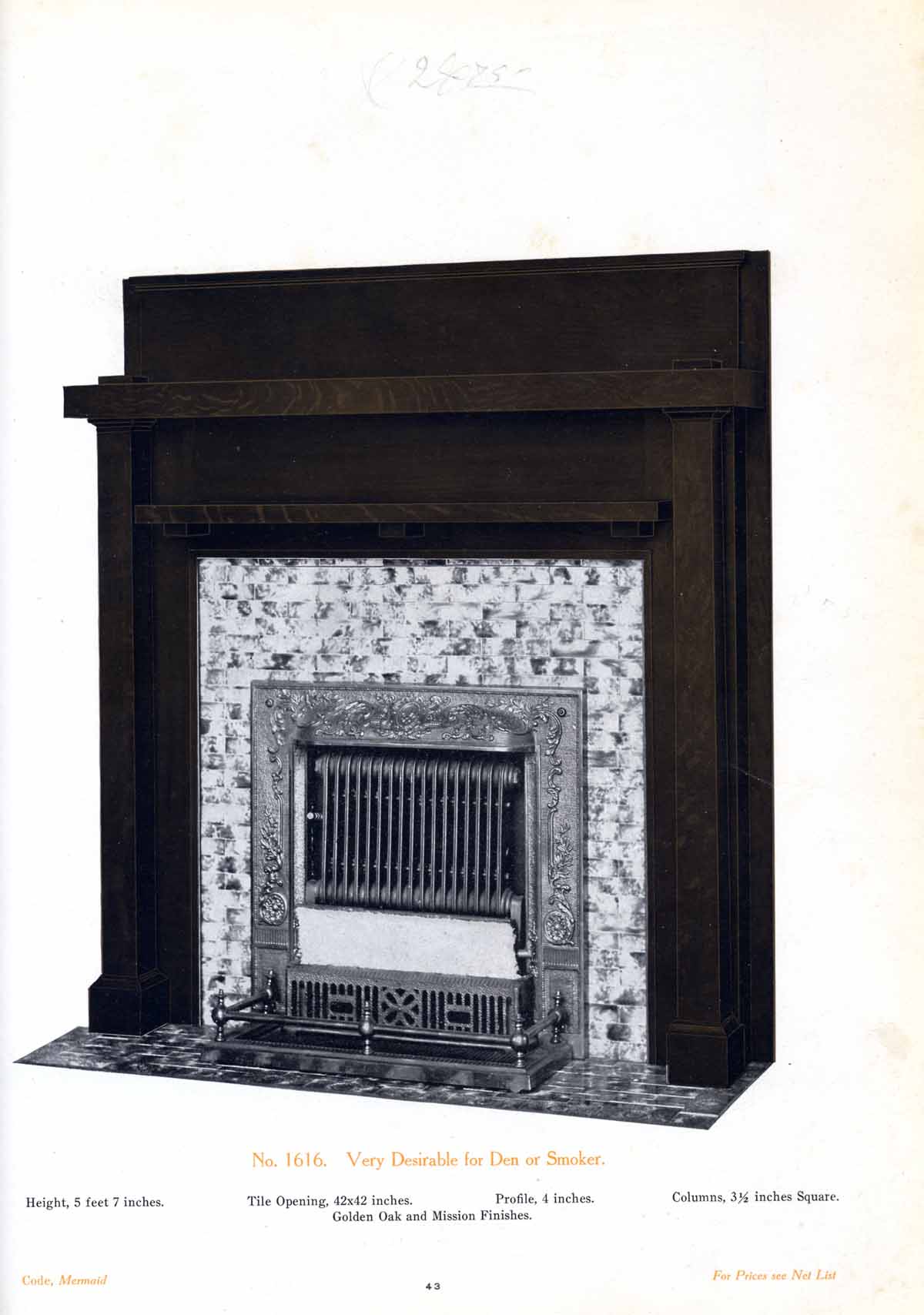 Enameled tiles are made in such a variety of colors and styles, that any taste can be met in this particular. On information as to your wishes in this regard, we make most careful selections, or if left to us, we select the best and most harmonious colors and designs which our experience tells us would suit your requirements. All hearths are sixty inches by twenty-one inches, but tile for twenty-four inch hearths can be had at an additional cost of fifty cents net.