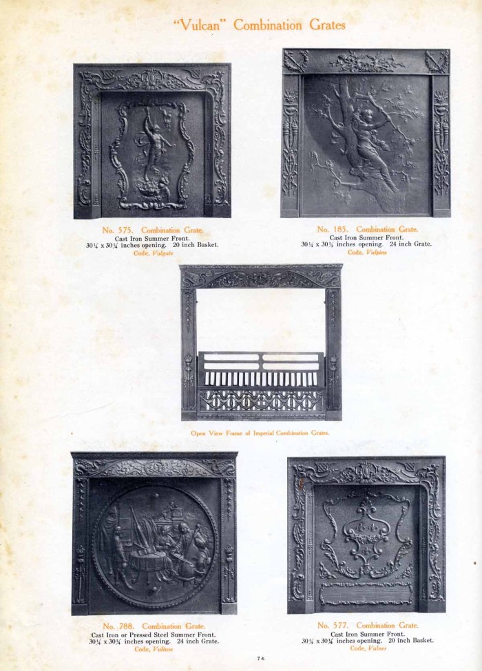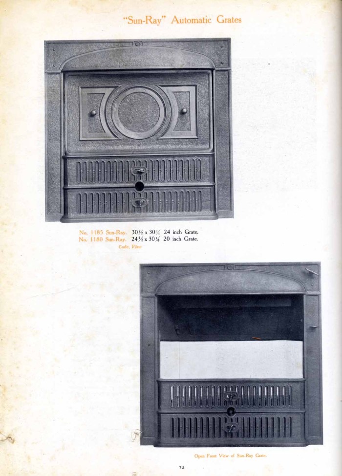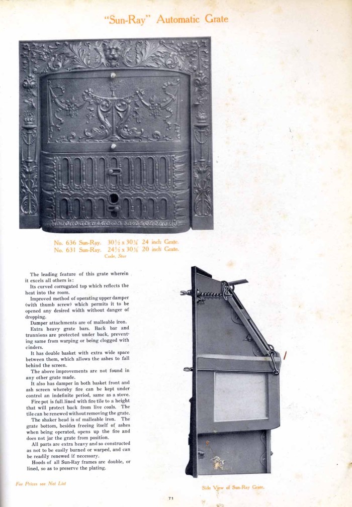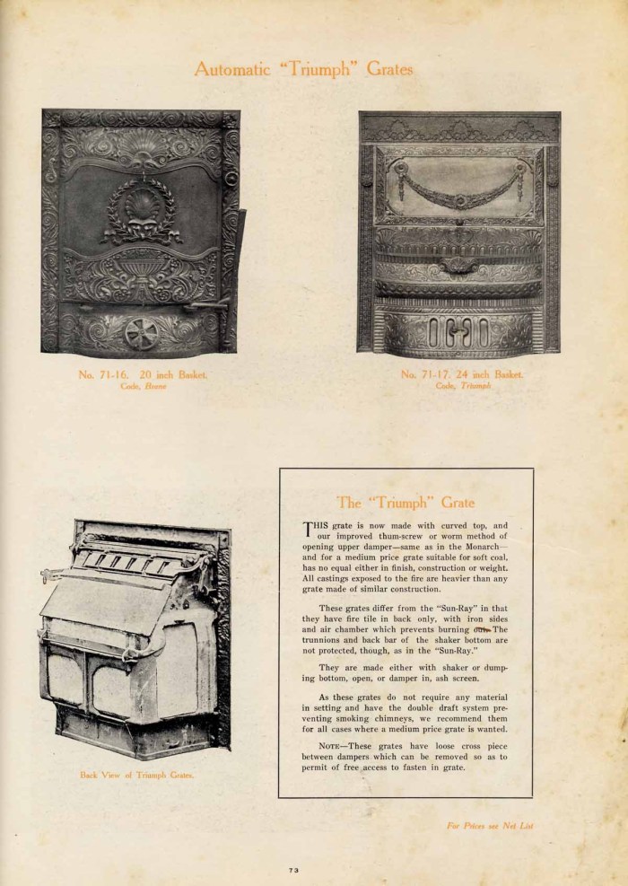 Grates are made in a number of patterns, but all of the very best castings, which will not be affected by any degree of heat. Some are highly polished, plated, or otherwise ornamented, and any preferred grate can be substituted for the one appearing in the illustration, as all are interchangeable. The openings (in the chimneys) for grates should be thirty inches high, thirteen inches deep, either twenty-four or thirty inches wide, as grates are in these sizes.