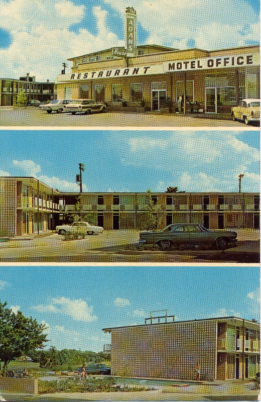 Travel Inn Motel, At the Intersection of U.S. 49 and U.S. 82, Indianola, Mississippi. Featuring “The Adams House Restaurant” and the Beautiful “Esquire Room”. Central Heating & Air Conditioning–Television–Phones–Swimming Pool–Free TWX Service