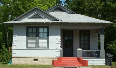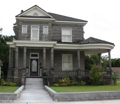 A well-appointed house, the Bowen House showcases the flexibility in designs of concrete block. According to the city of Biloxi plaque this house was built c. 1900, but does not show up on any Sanborn map till 1914. It utilizes a cornucopia of block types and other cast concrete features such as balustrade and columns, all set in a wonderful raised bead mortar joint. I believe I counted a whopping seven different 8”x 16” block faces plus several different size block. These seven include: Rock Face, Standard Plain Face, Rusticated Face, Cobblestone Face, a variation on the cobblestone block depicting elongated stones, a bizarre block featuring fractal lines and dashes, and an attempt at a vermiculated face. A 8”x 32″ block depicting an eight petal flower with stem, four seed pods and two leaves, is used as a belt course several places around the building. The Cobblestone Face, the variation on the Cobblestone Face, the bizarre block featuring fractal lines and dashes, and the attempt at a Vermiculated Face seem to be after thoughts and only occur on the west-facing two-story bay. (I apologize for the odd posting of photographs. I am still learning WordPress).