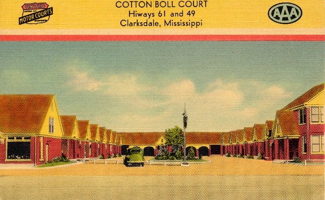 Cotton Boll Court, Hiways 61 and 49, Clarksdale, Mississippi. Innerspring Mattresses–Tile Bath–Shower over tub–Insulated–Gas Heat–Garages–Telephones. S.H. Kyle, Owner. Mr. and Mrs. W.B. Wilkinson, Managers.