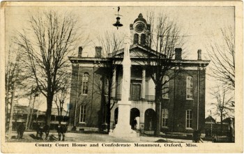 The Court House at Oxford is a well proportioned, rectangular building of modified Renaissance style. It was built since the Civil War, the original one having been burned when the Northern army devastated the town in 1864. The clock in the tower can be seen for miles from the roads leading into the town, the face being illuminated by electric light at night.