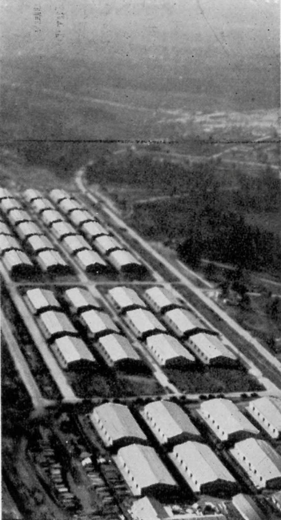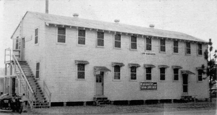 RAILROAD WAREHOUSES, CAMP SHELBY. These warehouses are in charge of the Quartermaster Corps, whose task is feeding, clothing, housing, and transporting the Army. The QM Regiment set-up for a square Infantry Division (18,400 men) is 41 Officers, 1 W.O., 845 Enlisted men who use 28 Passenger Cars, 50 motorcycles W/S/C, 286 1 1/2 ton trucks, 6 2 1/2 ton trucks, and 112 3/4 ton trailers to move the supplies from warehouses to company areas. Two QM Reg.’s service the two Divisions at Camp Shelby.