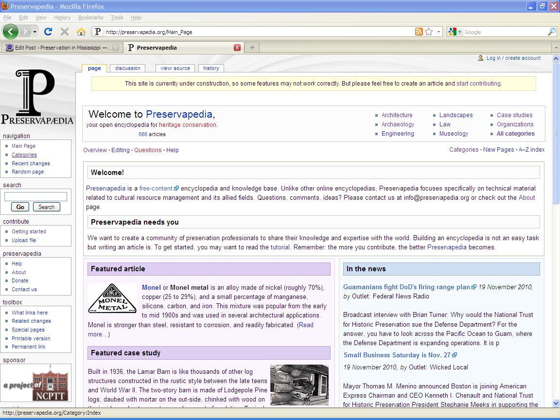 While still in the development stages, Preservapedia looks to be a promising website with 17 subcategories including:  Archaeology, Architectural Styles, Architecture, Building Components, Case Studies, Engineering, Historic Manufacturers, Landscapes, Law, Materials, Museology, Organizations, People, Policy, Suppliers & Manufacturers, Sustainability,  and Theory.  In 2010 the National Center for Preservation Technologies and Training recognized the potential for the site and became its primary sponsor.