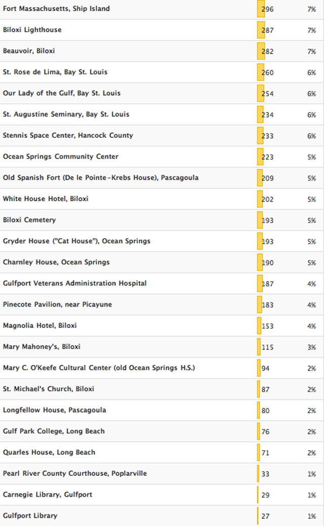 While, at the halfway point, the four Hancock County properties held enormous leads over the rest of the pack, down the homestretch, Fort Massachusetts, Beauvoir, and the Biloxi Lighthouse came back with a vengeance to take the lead. Walter Anderson’s Ocean Springs Community Center and Old Spanish Fort in Pascagoula also had strong late showings to pull up just behind the Hancock County properties. The fantastic Gryder House and Louis Sullivan’s Charnley House also moved up into the top tier, but the lovely and elegant Pinecote Pavilion only made it to the upper part of the lower tier. One of my personal favorites, St. Michael’s Church, remained way down on the list.