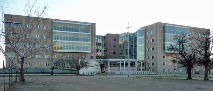Unfortunately, the new Jackson Federal Courthouse, designed by New York firm H³ Hardy has none of these qualities of solidity, serenity, or self-confidence. Instead, it is a bombastic but very taupe mass, not ugly really, but not specifically governmental either. It could be a large commercial office building just as well as a federal courthouse. More egregiously to me than its style or lack thereof, however, its position in front of the Medgar Evers Post Office, turning a mostly blank and taller wall to it, seems deaf to basic urban planning principles at best, and arrogantly ignorant of Jackson’s civil rights past at worst.