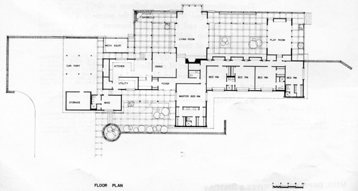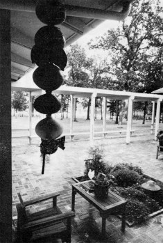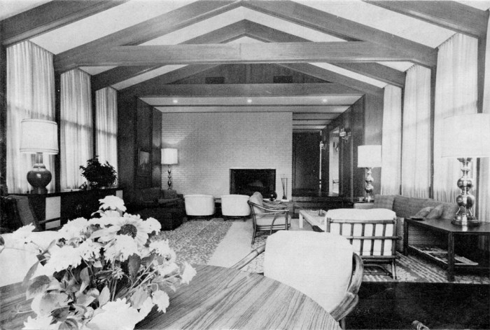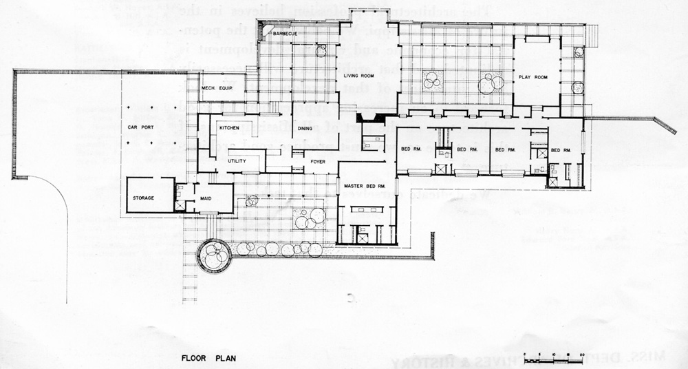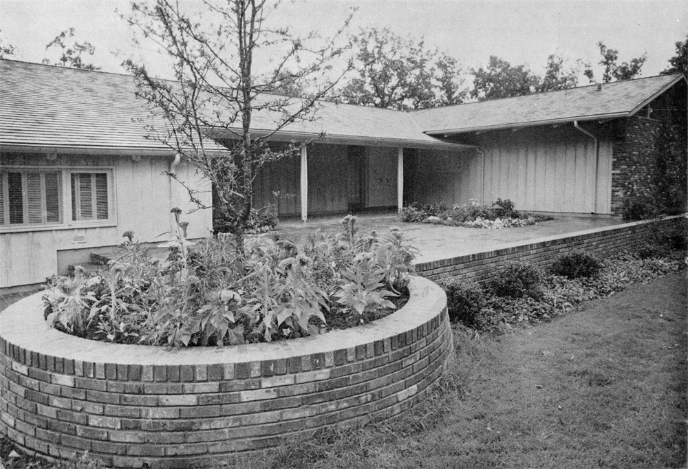 The owners do a great deal of entertaining and this consideration governed the arrangement of the living room, play room. and the two intervening courts all linked by a covered way. On occasion of large groups these four areas may be used together to form a useful succession of spaces.