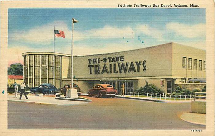 Those of you who watched last night’s excellent and evocative PBS American Experience documentary “Freedom Riders” saw clips of the riders walking into Jackson’s Tri-State Trailways station and then walking almost right back out into the police wagon to be taken to Parchman. The Trailways bus station is one that I wish I had been around to see, based purely on its curvy Modernist aesthetic. Unfortunately, it was demolished in 1976 to make way for the Davis Planetarium and the extension of Lamar Street, before anyone (at least anyone in power) cared to preserve either Modernism or Civil Rights sites.