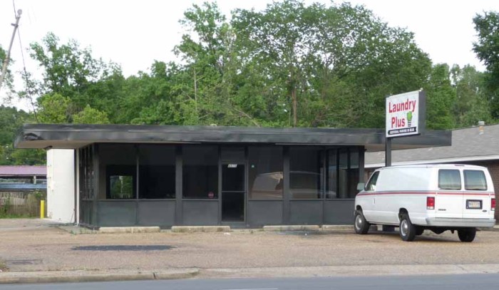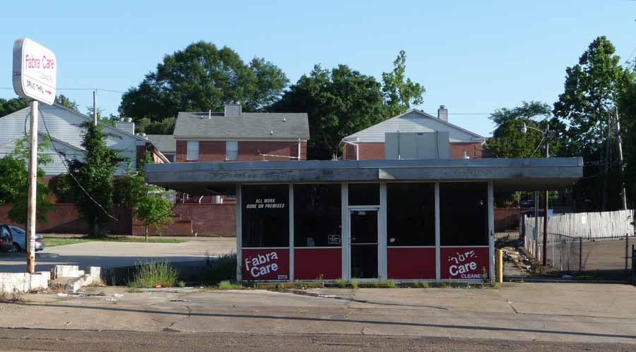 Tuesday’s post about the Trailways station and the former Petroleum building across that street that’s been transformed into what some have called a Darth Vader Building reminded me of a similar but smaller scale transformation to a building here in Jackson. For most of my 15 years in Jackson, these two Fabric Care Cleaners, one on Fortification Street in Belhaven, the other on Old Canton Road up around the Willie Morris Library, were twins (or maybe siblings, since the Old Canton building was wider than the one on Fortification). Unassuming little Modernist steel and glass and brick veneer structures, they still had a bit of flare with their bright red panels below the plate-glass windows and their broad flat awnings cantilevered out to shelter customers.