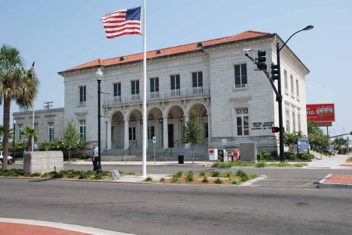 We turned north toward home on Highway 49 in Gulfport, so we end our journey with the best building in Gulfport, in my humble opinion, the Gulfport Post Office, opened in 1910 and designed by the Office of the Supervising Architect in Washington DC. Who says government architects can’t be good designers? Unfortunately, the building’s days as a hub of public activity are coming to a close, as the post office is moving to higher ground and no doubt, a more efficient and less impressive building.