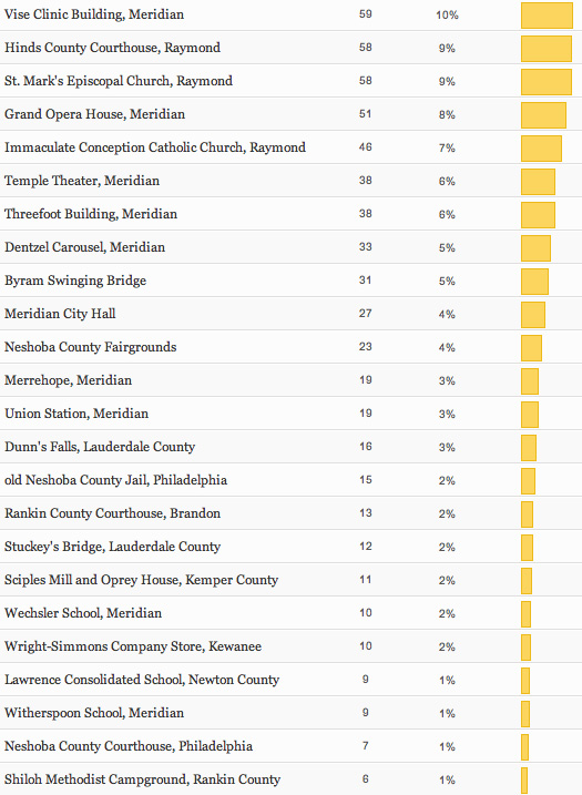 The results for the East/Central Mississippi poll are in, and it was down to the wire between the modernist Meridianites and the antebellum Raymondonians to see who would edge the other out. At the halfway point, Chris Risher, Sr.’s Vise Building held a commanding lead, but in the second half of the competition, the Raymond folk must have discovered the poll because they came back from the bottom half to almost squeeze out a victory for their iconic antebellum courthouse. The Vise Building still came out on top, with 10% of the vote, leaving other iconic and worthy Meridian buildings such as the Threefoot Building and Merrehope down in the middling crowd.