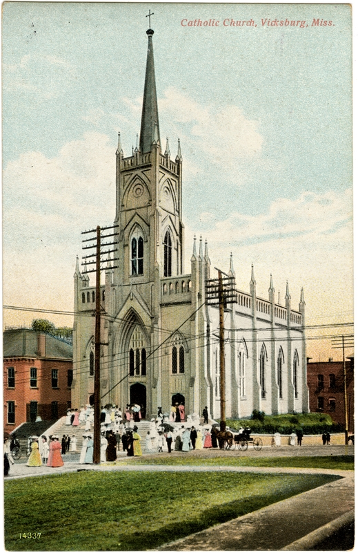 To set the stage, the Vicksburg American (1901-1910) was the Post‘s chief competitor, and at least on the Post’s side, they made no bones about their disdain. (At some point, I need to find the American article the Post took such exception to and also see if the American made a riposte.) I found a postcard image of St. Paul’s Catholic Church in the MDAH Cooper Postcard Collection for you to form your own opinions about the American‘s architectural analysis and of the Post‘s critical response. As is often the case in writing of this time period, offensive racial stereotypes make their way into the article right at the beginning, so be warned.