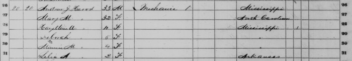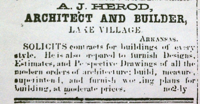 Knowing from the above advertisement that Herod was in Chicot County in 1861, Blake did some more digging and found him in the 1860 census, where we find that the “A” in “A.J.” stands for “Andrew.” In 1860, Herod’s occupation is listed as “Mechanic,” a common way of referring to building contractors in that day. In that census we also find that Herod was a native of Mississippi and was 33 years of age, born about 1827. That’s a lot more information than we started this post with!