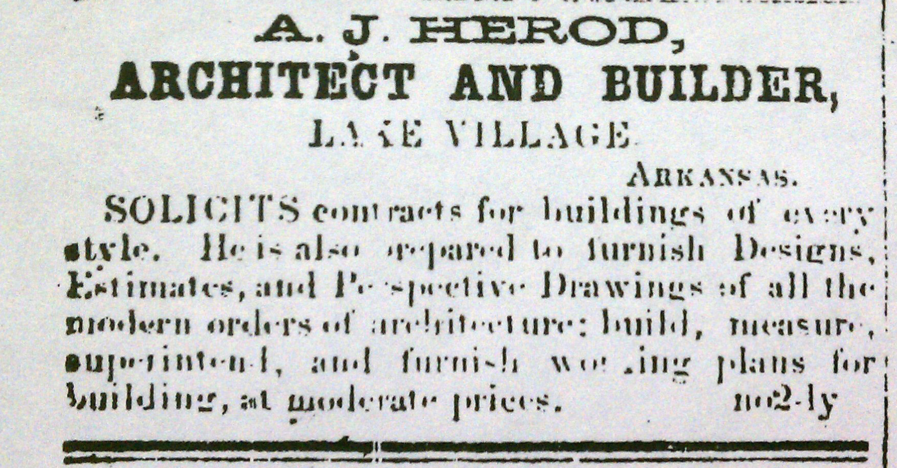 A. J. HerodArchitect and Builder,Lake VillageArkansasSolicits contracts for buildings of everystyle. He is also prepared to furnish Designs,Estimates, and Perspective Drawings of all themodern orders of architecture: build, measure,superintend, and furnish workings plans forbuildings, at moderate prices.