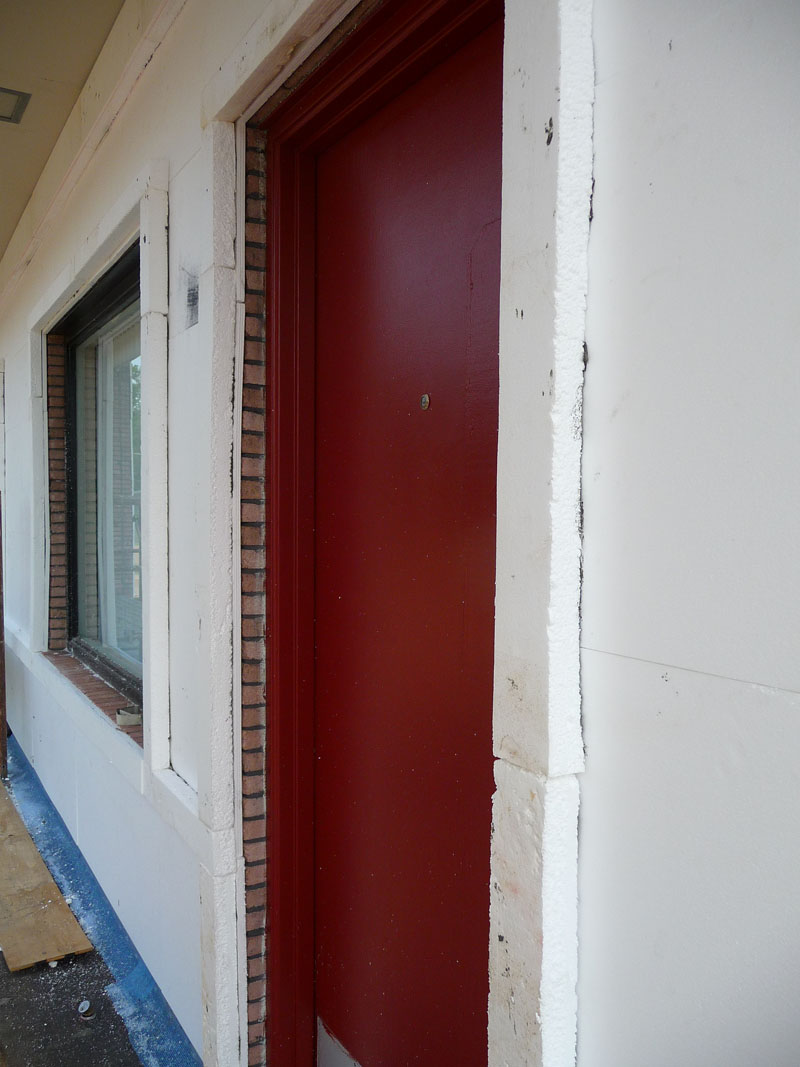 If wikipedia is to be believed on this topic (parts of the entry do sound a little boosterish), the European installations of the era you saw were probably over solid walls: “The use of EIFS over stud-and-sheathing framing (instead of over solid walls) is a North American technique.” So we Americans have only ourselves to blame on this one. I’d be interested too in knowing what material those early installations used as an underlay–surely not styrofoam as seen in this post? Do you have any detail shots of those German buildings?