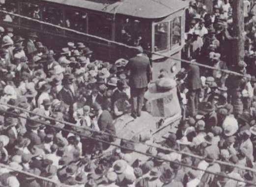 I checked out the page and clicked on a nice image of a crowd scene in Columbus that contained two trolley cars. In the lower left corner to my confusion I spotted a Renault FT-17/ M1917 6 Ton Light Tank?! Can you spot it in the picture above?