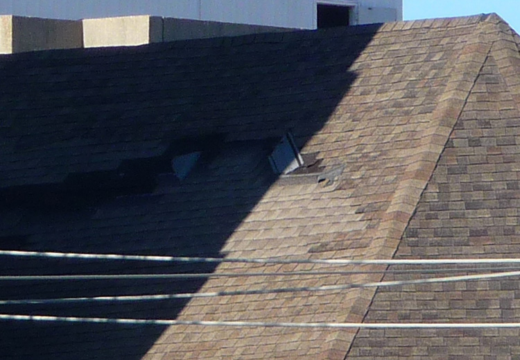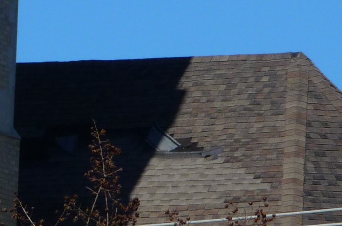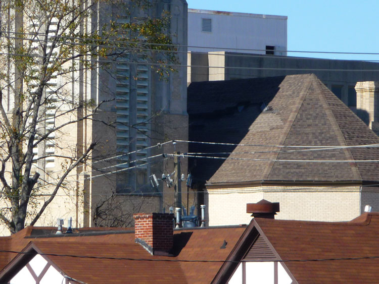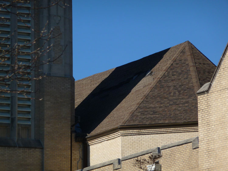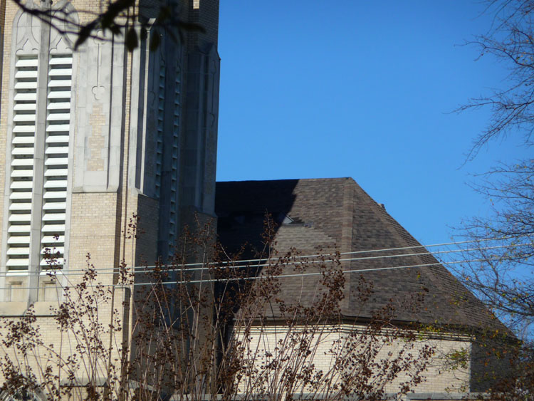 To check on this roof hole, I took a little trip downtown this last lovely weekend and found a couple of vantage points to take a look. Sure enough, it does appear that there’s a section of the roof without shingles, although due to the shadow from the steeple and the very long zoom I was using, I wasn’t able to verify its extent.