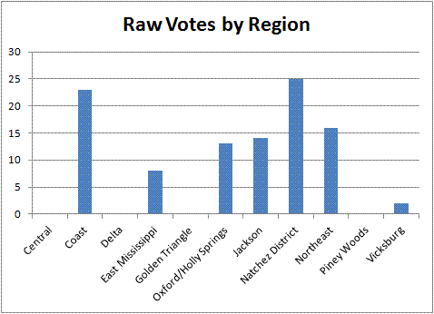 The first two polls, Natchez and the Coast, went like gang-busters, racking up vote totals in the 4,000s. The third, Northeast, was still eminently presentable but only had a third as many votes (1388). It was then that my non-statistical mind realized that when we got to the end, it was going to be more complex than I thought to put together the various polls in any fair or meaningful way. Inevitably, some regions were going to get the short end of the stick.