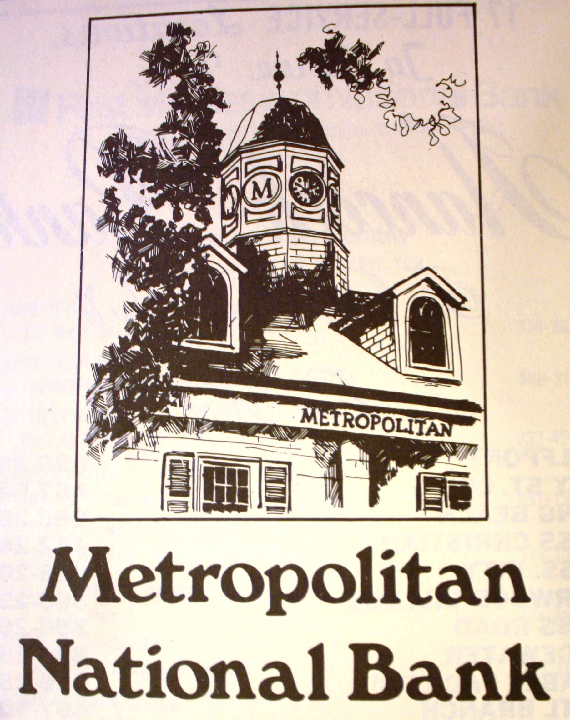 The Hancock Bank building was built in a similar rejection of modernist style. The building started life as the Metropolitan National Bank in 1975. The architectural rendering above shows a slightly different design than what was built. The proposed design was more southern/ New Orleans in appearance, with plantation shutters and a combination court yard, drive up teller window. The style chosen for construction had more of a East Coast colonial design (think Wren Building at the College of William and Mary).