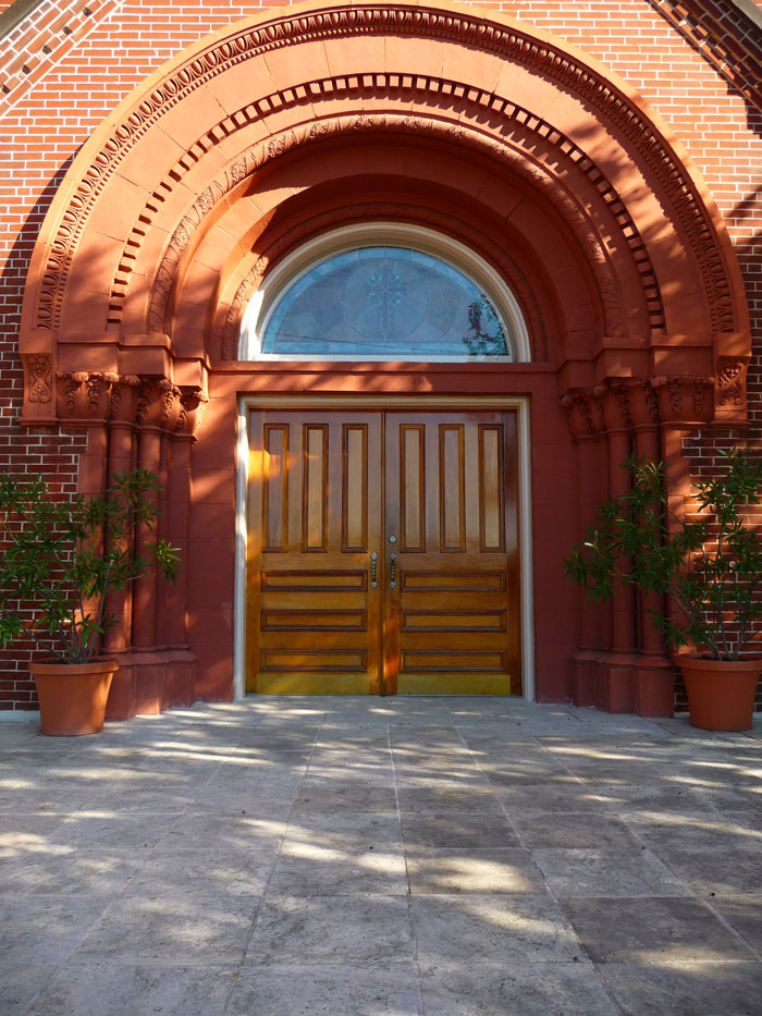 Yes, an unglazed terra cotta–really beautiful! The supports are better termed “engaged columns” since they’re rounded like columns rather than flat like pilasters. In a real Romanesque church, this whole entry would be called a “portal” and would be the primary decorative feature of the building, These recall Christ’s “I am the Door,” and would be filled with iconic carvings usually showing the Last Judgment (http://www.flickr.com/photos/26519181@N06/4654637760/, and for scale of what all those little details really are: http://www.flickr.com/photos/26519181@N06/4654022127). This portal on St. Mary’s is the main emphasis, but also competes with two corner towers, and of course features classical details rather than religious symbols.