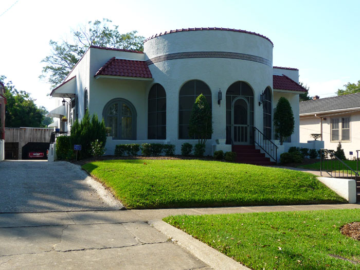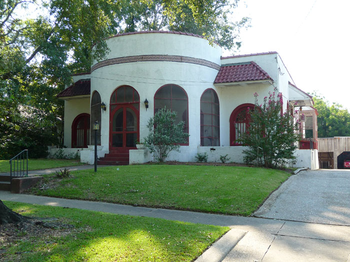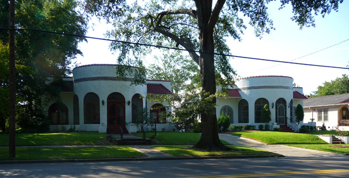 Distinctive, and possibly unique with their prominent semi-circular front porches, these houses combine the Mission style (tile roofs, smooth stucco) with a compact bungalow form. Their decorative details (mainly a tile “cornice” band in a modified Greek Key design) and finishes are so smooth and abstracted that they seem almost Art Moderne in some way too. And with those beautiful arcaded screened porches, they are definitely well-adapted to their Deep South climate.