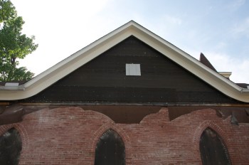From the looks of things on April 11th, work has finally begun on the exterior of the building.  The former particle board covering the gable area has been removed and new underlayment placed.  I am not sure what the tar paper in the windows and front door signify.