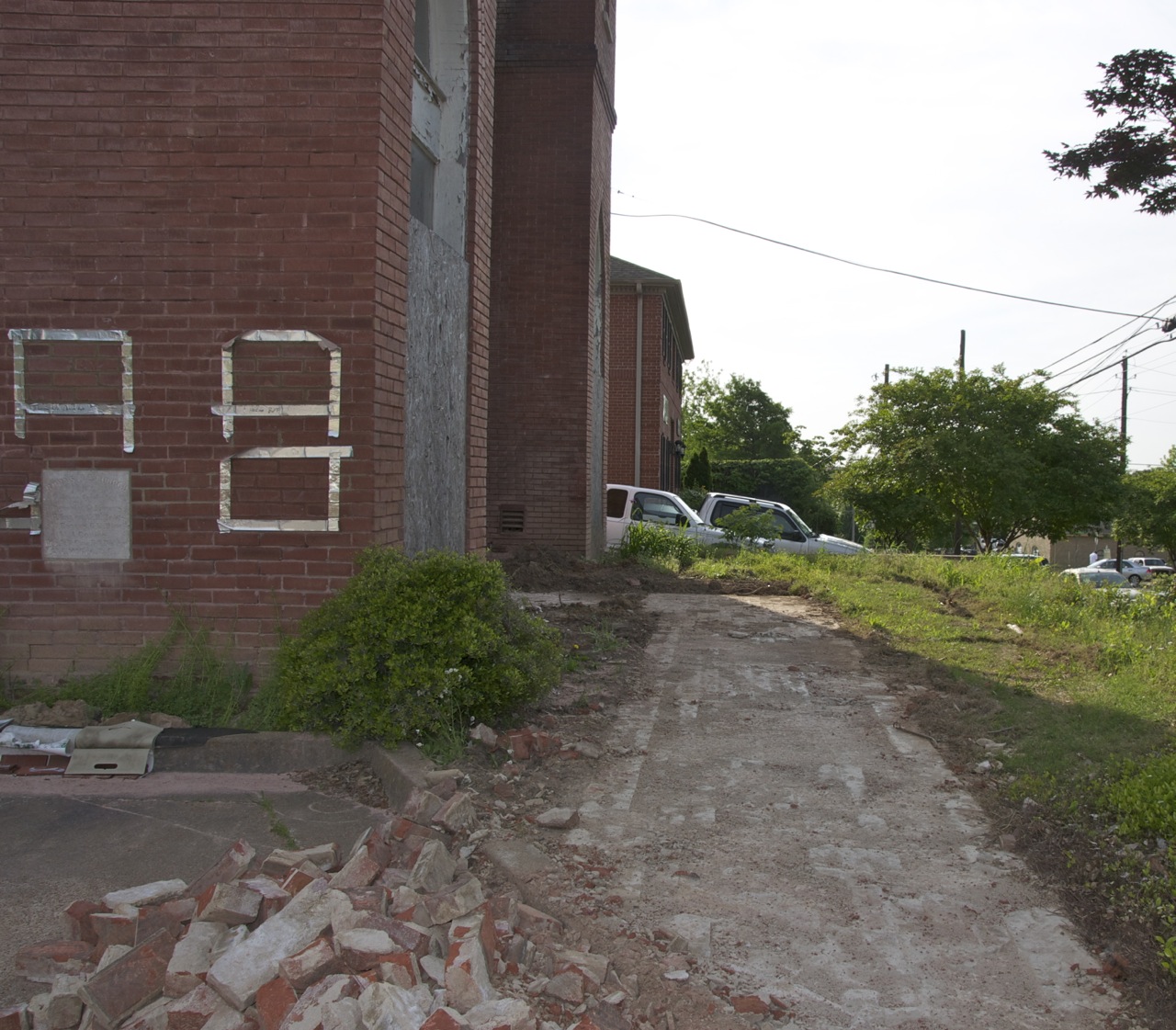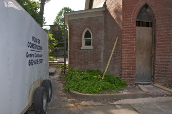 1. The door and window openings are blacked in because the work underway includes replacing the non-original windows and doors (that were previous replacements installed in the late 1970s). The contractor has removed the existing units but is awaiting delivery of the new units. The original window on the building’s front (street) side is being restored – for the past thirty-two years, it has been a door.