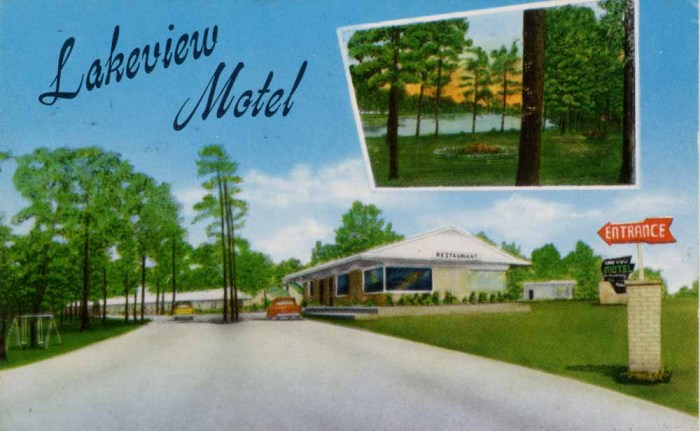 We seem to have different stories about this one. I am inclined to go with Linda Hawk’s, but this story was relayed to me by an aunt (now deceased) that lived across from the Lake View Motel. The owner of the lake and the motel was a wealthy man named Kenneth Muse. He lived on the east side of the lake in a large, beautiful home by the standards of the time in 1950-51. It still sits behind the modern building currently on the east side of the lake. With Google you can see the house clearly from above and on the ground view see a small portion of the house. The building that housed the restaurant seen on the postcard is still there, but the rooms that can be seen in the background are long since gone. The lake is not small. It is over 1000 feet from the dam to the front. The house and the motel rooms were turned into a rest home many years later.