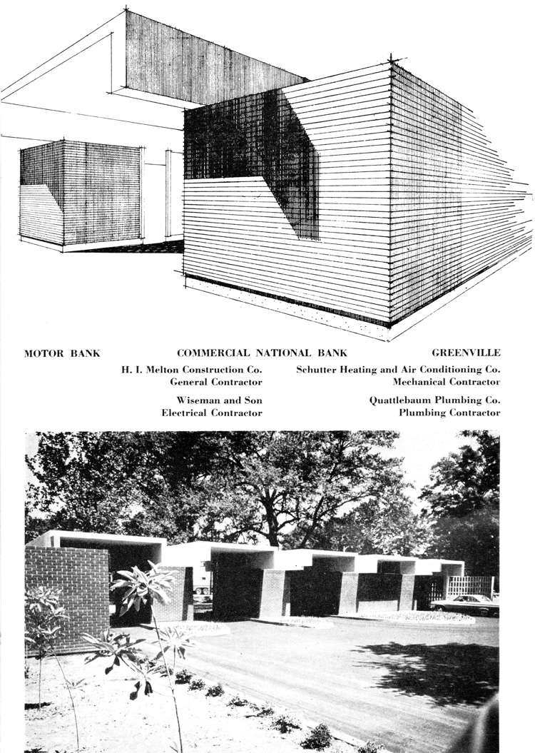 The August 1964 issue of the Mississippi Architect magazine features a building type that I hadn’t even noticed on the landscape until Thomas Rossell started pointing it out to me: the motor bank, better known to us today as the drive-through bank. The fact that a monthly magazine targeted toward Mississippi’s architects highlighted the Greenville Motor Bank indicates that architects were finding themselves getting jobs designing these new types of structures and that they were looking for other examples.