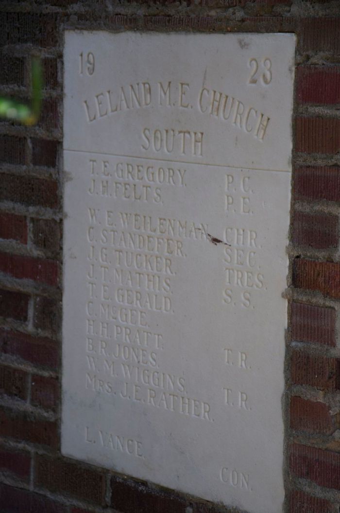 The Leland Methodist Church was constructed 1923-24 in a Mission, Spanish Revival style. The MDAH HRI database references similarity of the design of the Fayette, Alabama Methodist Church in crediting the architect (T. L. Brodie, conjectured) and builder (L. Vance, conjectured).  The cornerstone identifies L. Vance as the contractor, however.