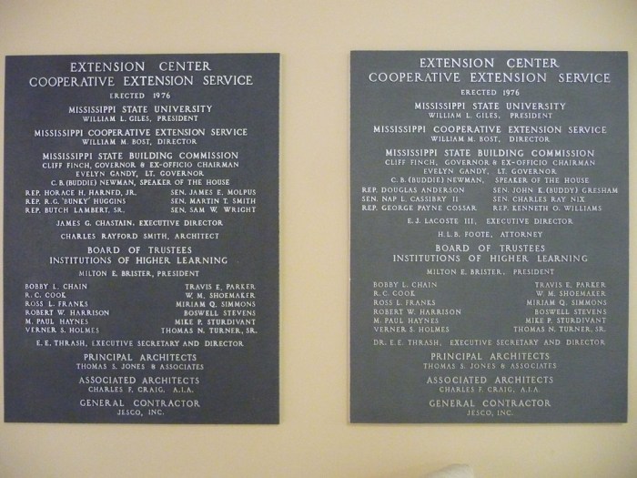 I was up at Mississippi State University recently and decided to walk through a building I had never actually seen inside before, the Bost Extension Center. As always, I made sure to check out the plaque in the lobby telling me important information about the building, like construction date, architect, builder, etc.