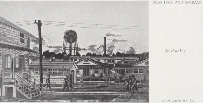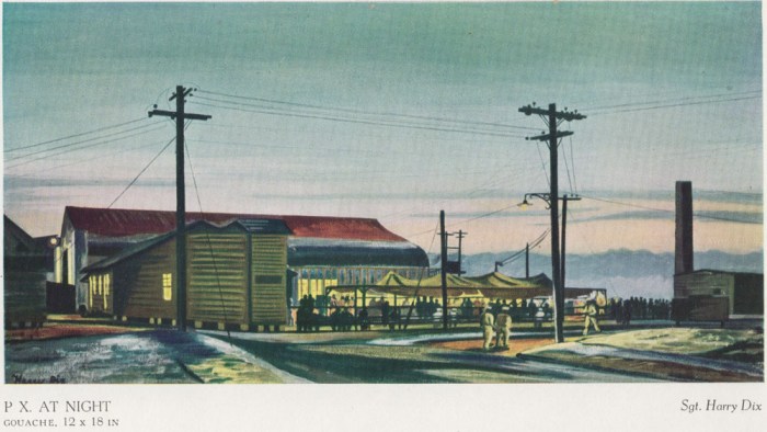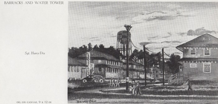In yesterday’s Veteran’s Day post, we saw a few of the murals that soldiers created while stationed at Keesler Air Base in Biloxi during World War II. Today, after an introduction to how the “Soldier Art” program operated on the base from its director, T/SGT Paul Magriel of the Camouflage Division, we’ll see some of the oil paintings, mostly of life on the base. In these you can see the closely packed barracks, all standardized buildings, and that iconic water tower, ever-present. The fact that most of these are views of the base at night or dusk may show that this was when the soldier artists had free time, or maybe it was just the most pleasant time of the day, when the heat of the sun finally died and things got relatively quiet.