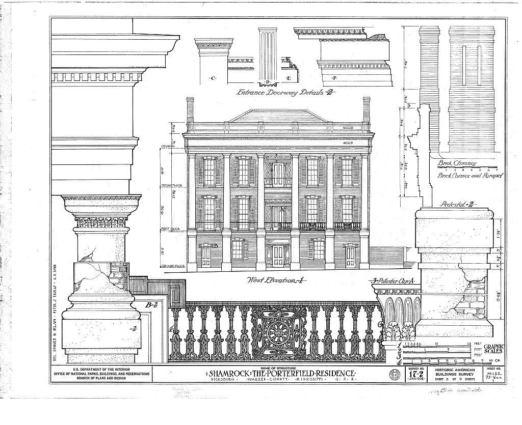 Porterfield House (“Shamrock”), Vicksburg. Elevation and details by HABS team, Jan/Feb 1934. Wm. A. Stanton, Thos. J. Biggs, Harry Philips, Daniel Finlayson, Jay T. Liddle, Jr., delineators.