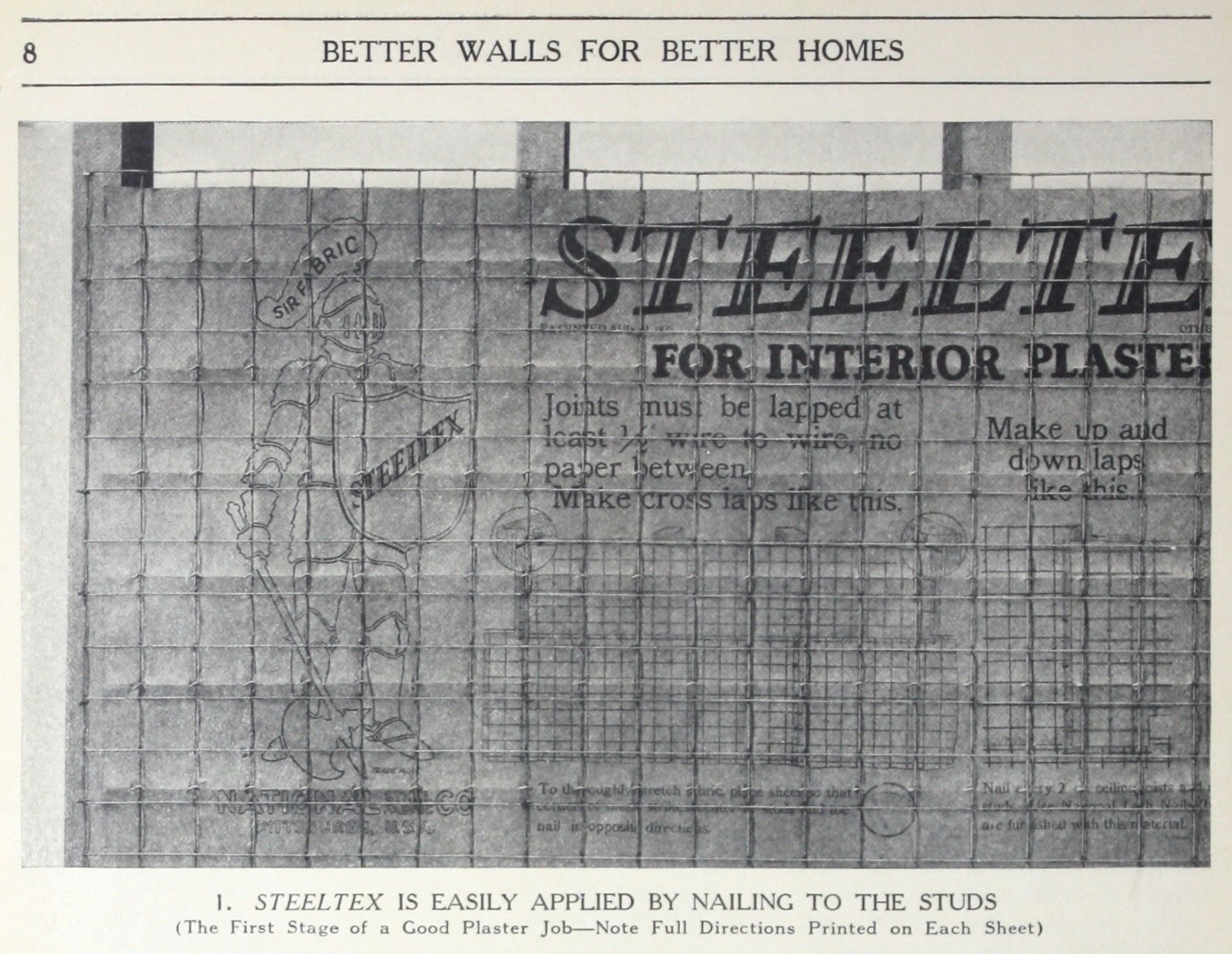 Steeltex wire lath for interior plaster prior to plaster application. Detail from page 8. Better Wall For Better Homes. National Steel Fabric Corporation. Pittsburgh, PA 1927
