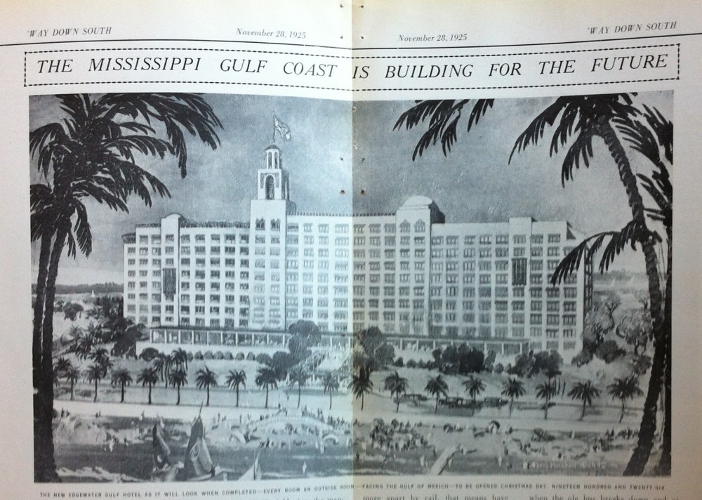 Edgewater Gulf Hotel BIloxi Harrison County rendering signed by Benj. Marshall, Archt. from ‘Way Down South Magazine Nov. 28, 1924 from Harrison County Library collection