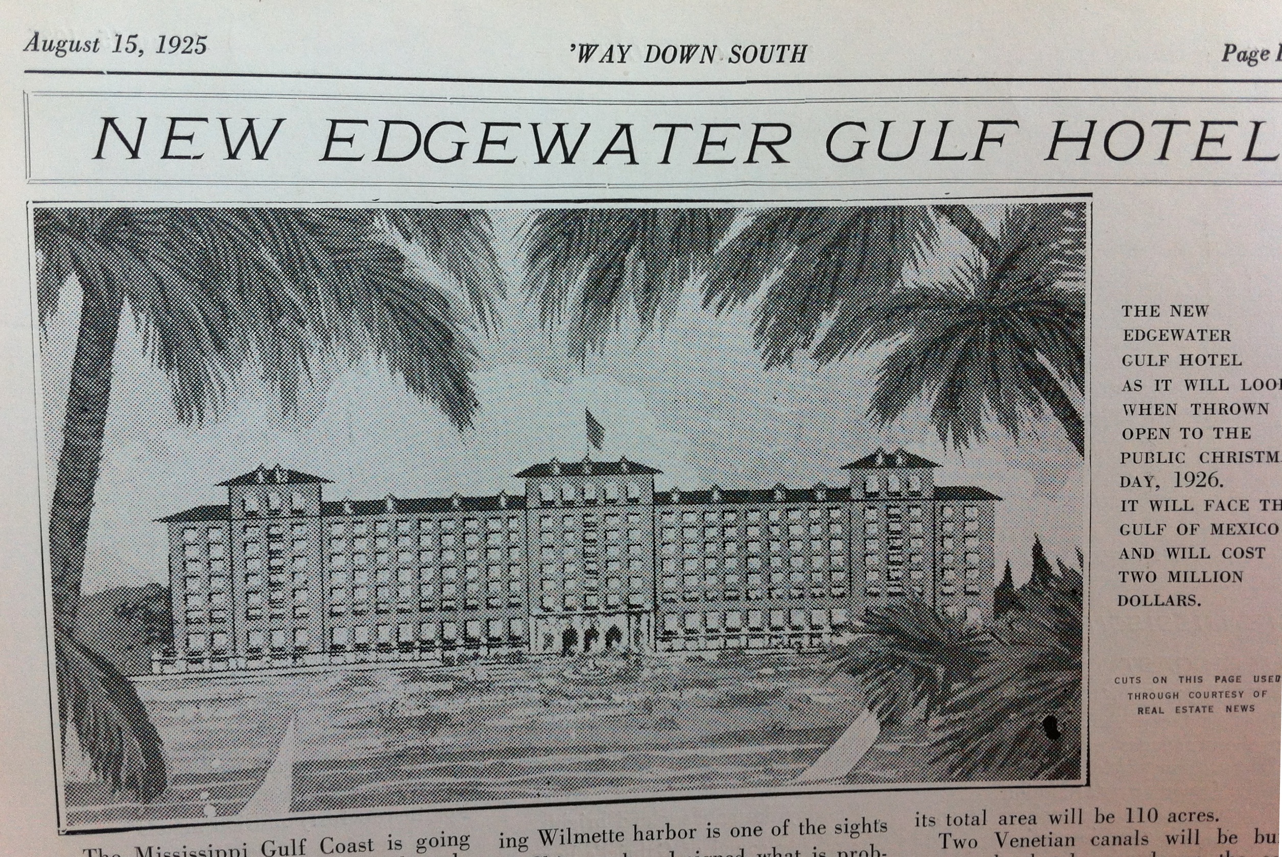 Proposed Edgewater Gulf Hotel Biloxi Harrison County ‘Way Down South Magazine August 15, 1925 from Harrison County Library collection