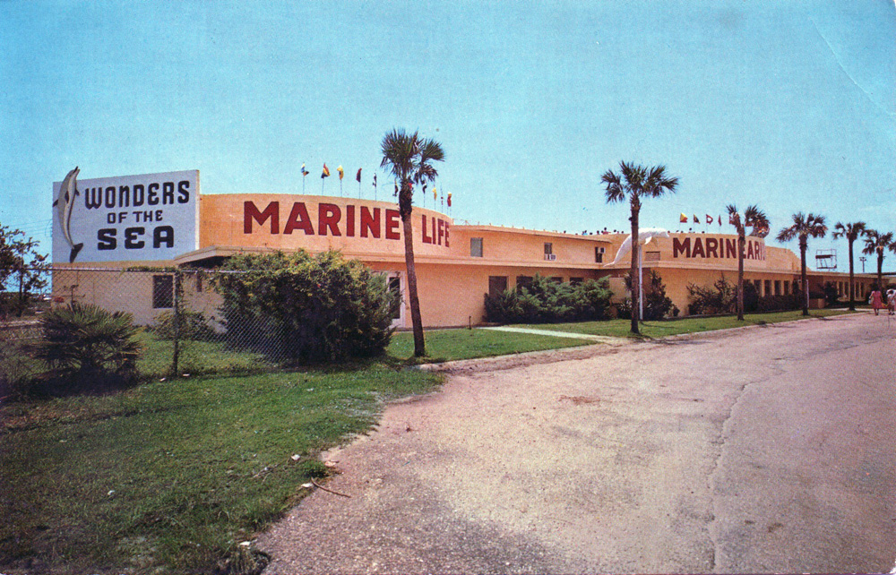 MARINE LIFE ON THE BEACH, Gulfport, Mississippi. Entrance to fabulous Marine Life where there is action every minute. Here, through large picture windows you see many wonders of the sea, as divers descend before your eyes to feed and play with the hundreds of marine specimens–educated porpoises–entertaining seals–giant sea turtles–and many other aquatic actors of the deep.