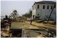 Looking southwest along what remains of Beach Boulevard. MDAH employee Grady Howell stands near damaged bank building. Bay St. Louis, Hancock County, MS. Monday, September 19, 2005 MDAH Hurricane Katrina Photographs